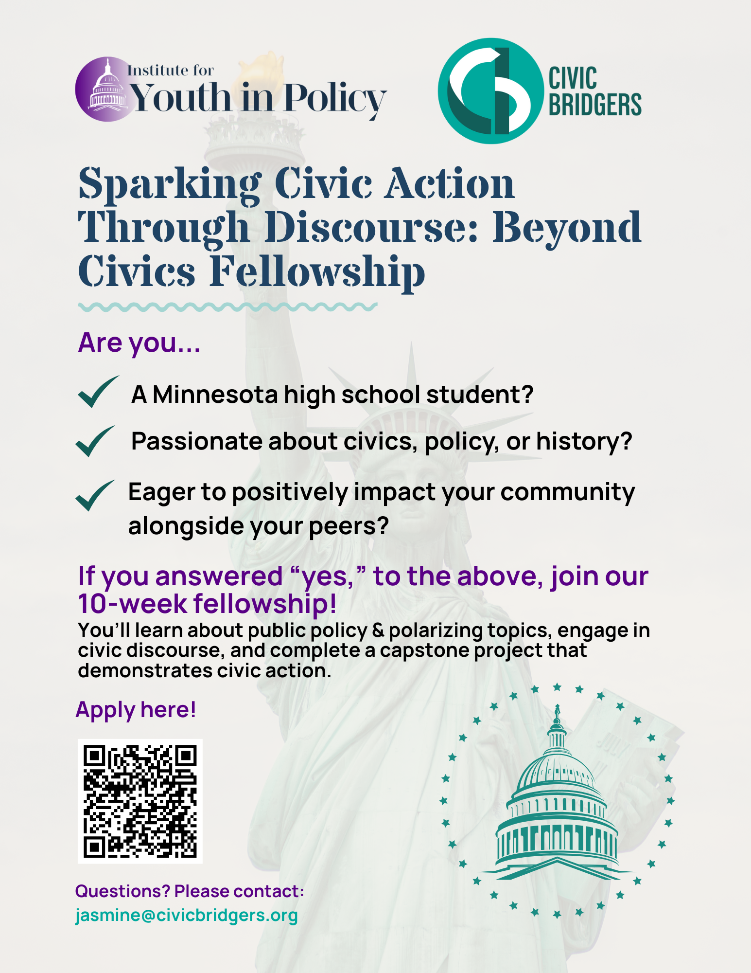 BEYOND CIVICS VIRTUAL FELLOWSHIP A program for Minnesota teens who are motivated to understand differences and bridge divides in service of their communities. Explore our Beyond Civics webpage to learn more about the program! Parent/Guardian Name * First Name Last Name Parent/Guardian Email * Participant Name * First Name Last Name Participant Email * What high school do you attend? * What year are you expected to graduate? * 2026 2027 2028 2029 Application Question 1 * Why are you interested in the Beyond Civics Fellowship? (5-7 sentences) Application Question 2 * What does 'civic engagement' mean to you? (3-5 sentences) Application Question 3 * Why is it important to collaborate with people different from you? (3-5 sentences) How did you hear about us? Community Leader Friends Parent/Guardian Social media School Teacher/Educator Other Thank you for your application. We will reach out to you shortly.