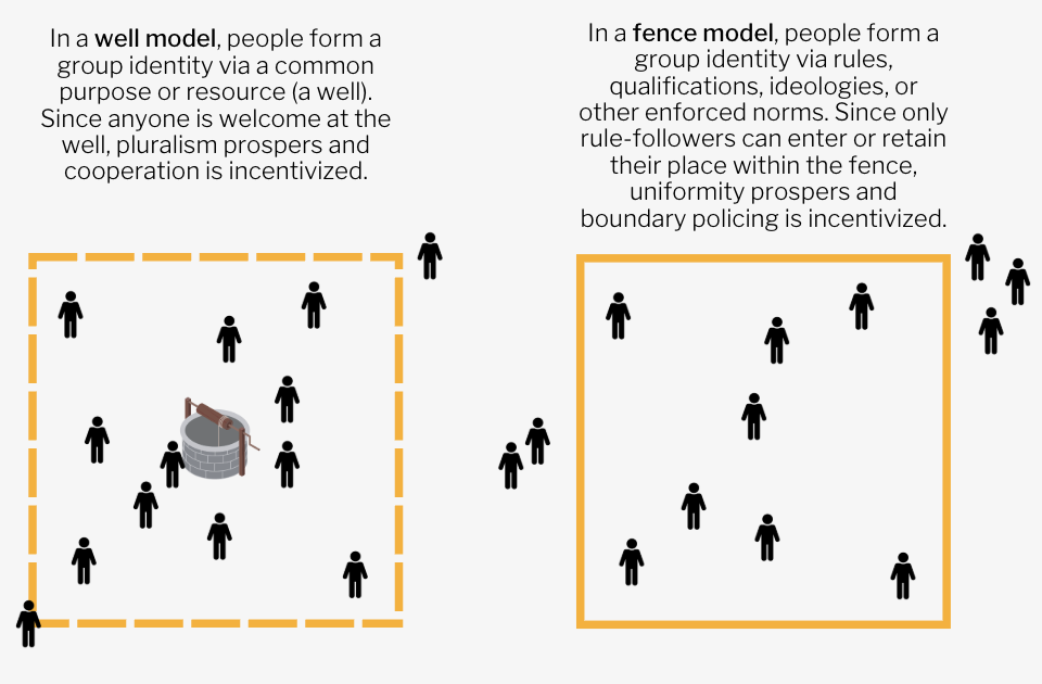 To represent this, we use a Wells and Fences model. Rabbi Jonathan Sacks formally presented the Wells and Fences model in The Dignity of Difference (2002; revised 2003) after studying religious communities. He found that humans naturally sort into groups, but can choose whether those identities create exclusionary boundaries (fences) or shared spaces of encounter (wells).